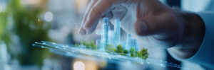 A sleek design studio where AI-powered tools assist architects in creating sustainable buildings with dynamic 3D models and real-time environmental simulations.AI in architecture,