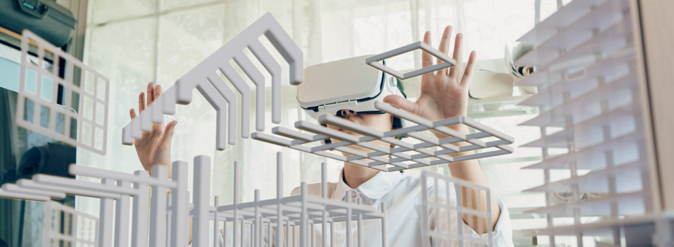 Asian woman Architect or Engineer wearing VR headset for working design 3D architectural precast concrete building model with BIM technology and virtual reality technology. Concept futuristic design.