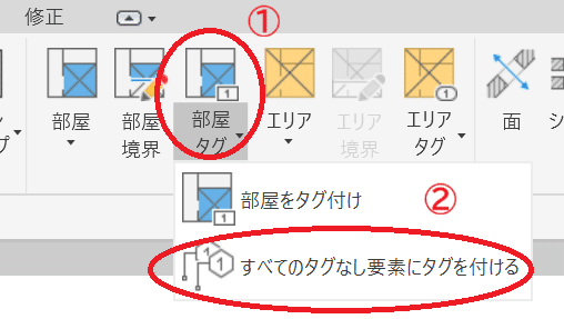 「建築」タブ>部屋/エリア パネル>【部屋タグ】>「すべてのタグなし要素のタグを付ける」を選択します。