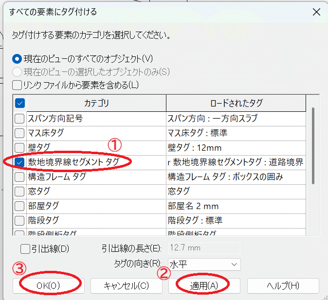 ①【敷地境界線セグメントタグ】にチェックを入れ、②適用→③OKをクリックします。