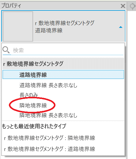 プロパティの下記の部分を「隣地境界線」に切り替えます。