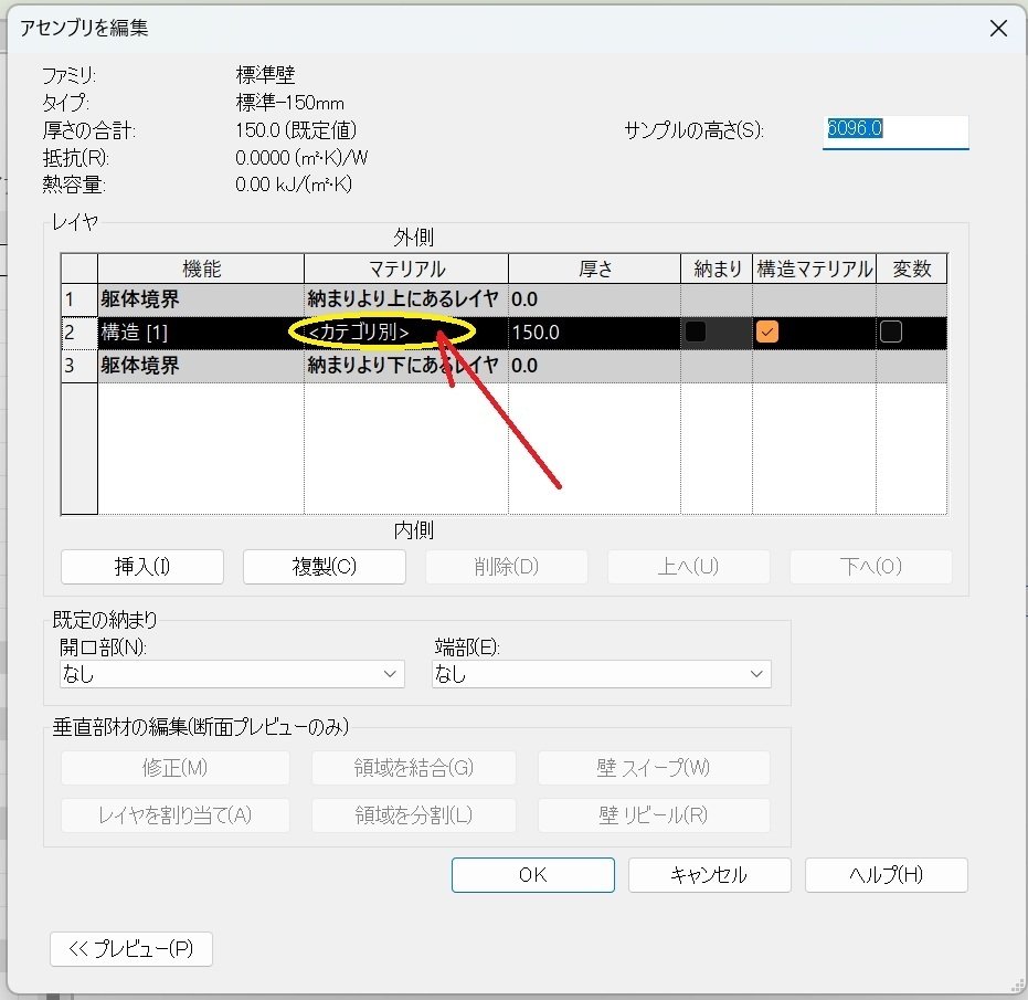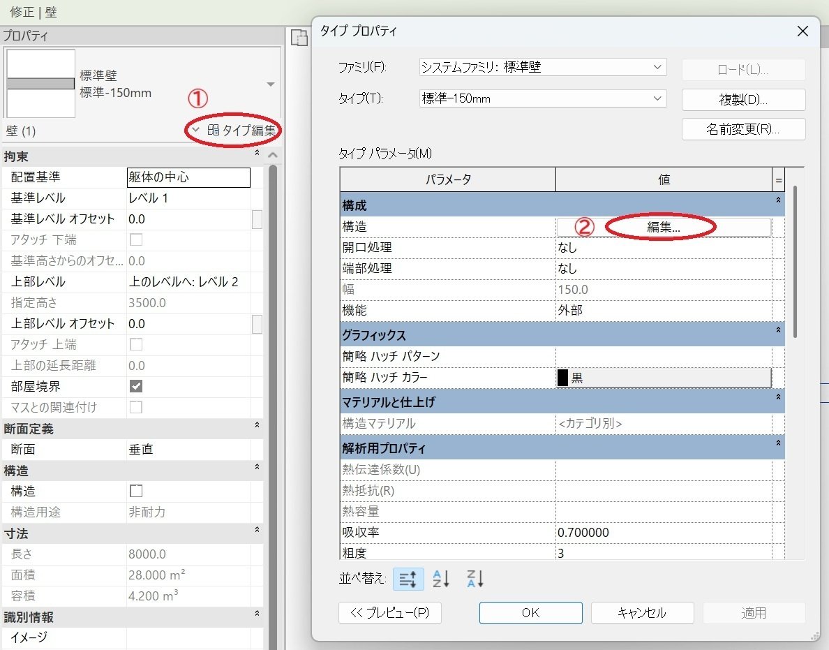 別1. タイプ編集をクリックし①、タイプパラメーターの構造をクリックします。
