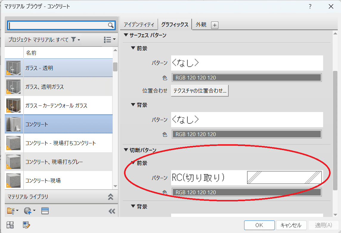 3.パターン上書き設定の前景の「パターン」の右側の<優先順位なし>をクリックすると、下図のようにハッチングの一覧が表示されるので「RC(切り取り)を選択します。