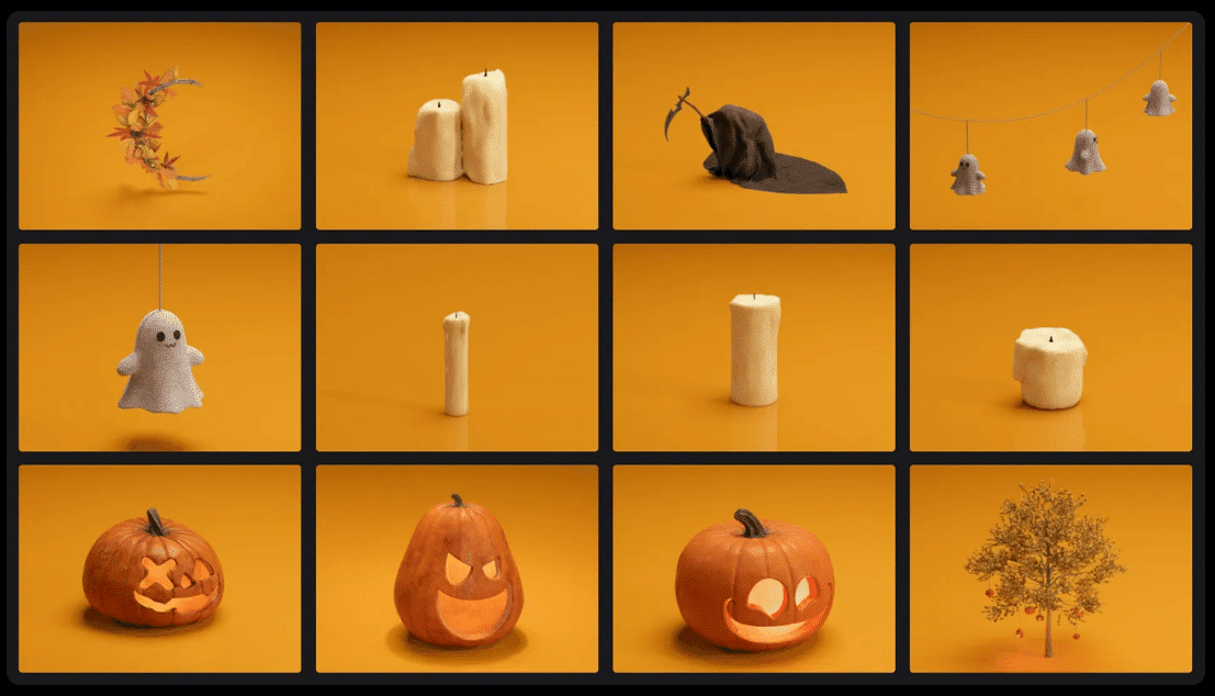 秋のリース、カボチャ、不気味な墓石、幽霊など、ハロウィンをテーマにしたアイテム。